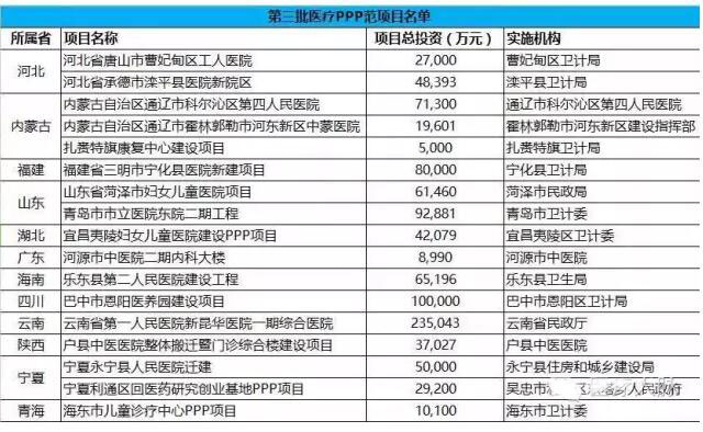 10月13日,《关于联合公布第三批政府和社会资本合作示范项目加快推动示范项目建设的通知》(下称《通知》)通过财政部官方网站正式对外发布。《通知》共涉及能源、交通、水利、环境、农业、科技、林业、医疗卫生、保障性安居、养老、教育、文化、体育、市政工程、基础设施、旅游、城镇综合发展等多个方面,其中有17个项目与医疗卫生相关,项目总投资达98.327亿元。